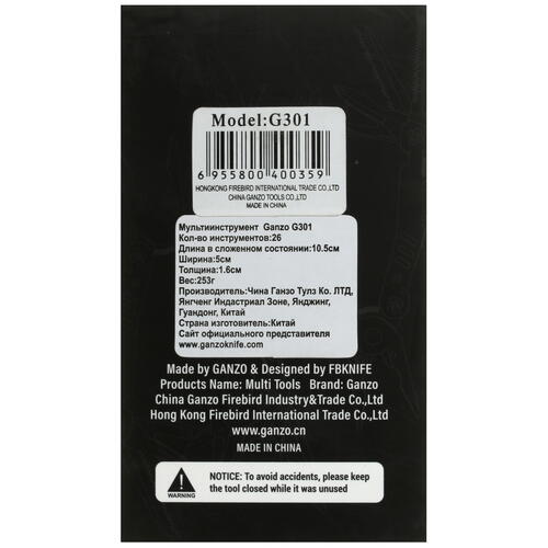 Инструмент Ganzo G301 идет в комплекте с плотным чехлом для хранения и блистером с битами. Благодаря прочному пружинящему механизму и замку Axis Lock вы можете не бояться, что лезвия ножей или других насадок случайно откроются в кармане. Мультитул с расширенным набором функций заменит даже небольшой молоток, огниво и приспособление для захвата цилиндров и гаек.