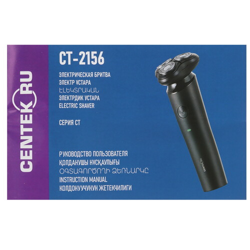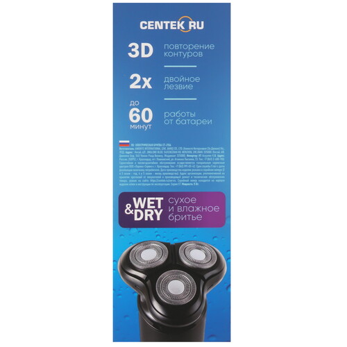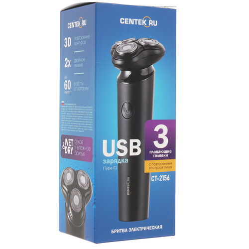 Электробритва Centek CT-2156 получает питание от сети и аккумулятора. Одного заряда хватает для 60 минут автономной работы. В комплекте поставляются кабель USB и чистящая щеточка.