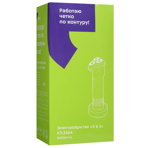 Электробритва Kitfort КТ-3164 оборудована 3 секциями с плавающими головками, которые повторяют контуры лица и достигают труднодоступных участков. Модель относится к роторному типу, отличительная черта которого заключается в удалении даже коротких волосков. Подравнять растительность на лице можно с помощью триммера.