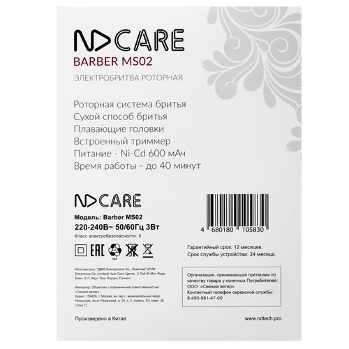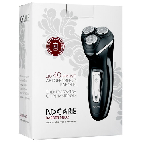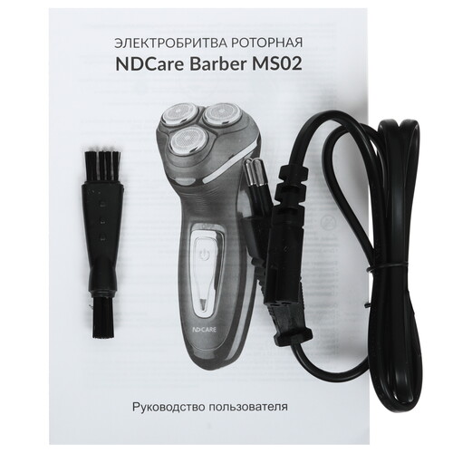 Электрическая бритва NDCare Barber MS02 питается от сети или автономно от аккумулятора, заряда которого хватит на 40 минут работы. Для полного восстановления заряда потребуется ориентировочно 480 минут, а зарядный кабель прилагается в комплекте.