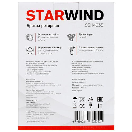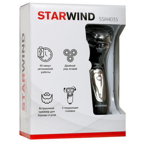 Электробритва Starwind SSH 4035 может похвастаться наличием подвижных головок, которые следуют по контурам лица, позволяя удалить щетину из самых труднодоступных участков. Мощный аккумулятор устройства не разрядится на протяжении 45 минут. Для бережного и безопасного хранения воспользуйтесь специальной крышкой из комплекта, а для своевременной очистки – небольшой щеточкой.