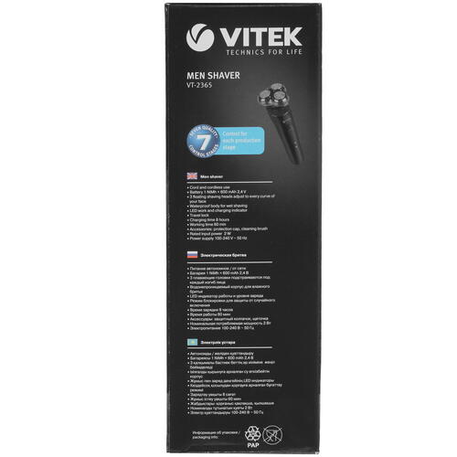 Защитный колпачок обеспечивает электробритве Vitek VT-2365 блокировку от случайного включения, что не даст устройству случайно включиться, будучи упакованным в багаж. Специальная щеточка, предусмотренная в комплекте поставки, позволит очистить головки от волосков, также устройство можно мыть под струей воды. Подзарядка аккумулятора бритвы занимает традиционные 8 часов. Для удобства пользования прибором на корпусе предусмотрена система индикации.