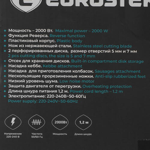 Мясорубка электрическая Eurostek EMG-YK03K призвана занять почетное место на каждой кухне, ведь с ее помощью вы сможете ежедневно наслаждаться вкусом множества блюд. Несомненным достоинством прибора является впечатляющий набор насадок, позволяющих приготовить кеббе и сытные колбасы.