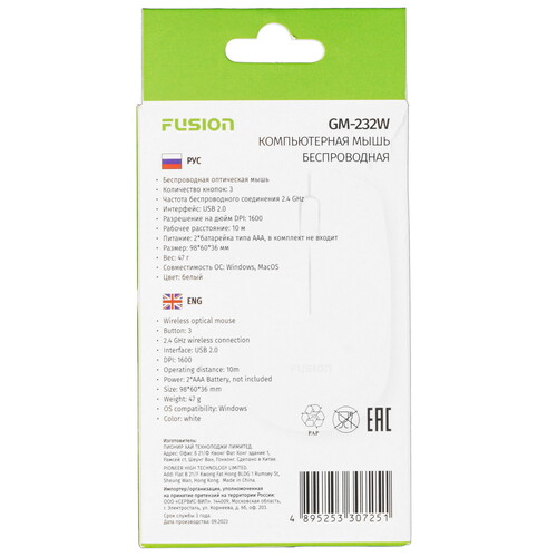 Мышь беспроводная Fusion GM-232W обладает эргономичным корпусом из матового пластика белого цвета. Текстурированная поверхность боковых граней обеспечивает комфортное удержание мыши и манипулирование ей. Симметричная конструкция позволяет захватывать мышь и правой, и левой рукой. Разрешение светодиодного датчика составляет 1600 dpi, благодаря чему движение курсора по экрану осуществляется точно и быстро. Для поддержания мыши в рабочем состоянии необходимы 2 батарейки ААА.