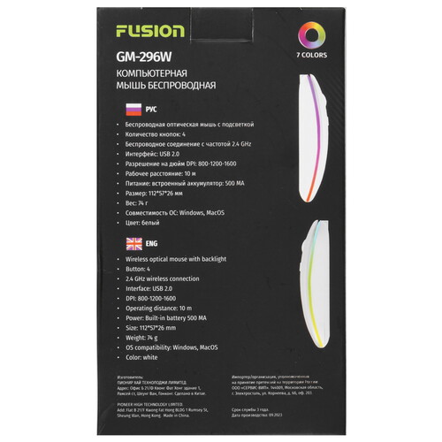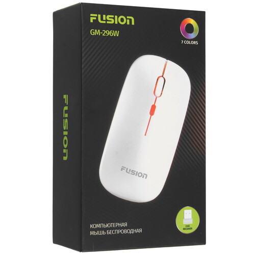 Компьютерная мышь со встроенной многоцветной подсветкой Fusion GM-296W укомплектован миниатюрным ресивером с внешним коннектором USB Type-A. При подключении к ПК или ноутбуку донгл устанавливает соединение с мышью по радиоканалу на расстоянии до 10 м. Источником энергии для мышки выступает интегрированный аккумулятор. На корпусе устройства имеется разъем Type-C для подзарядки и порта ПК или сетевого адаптера.