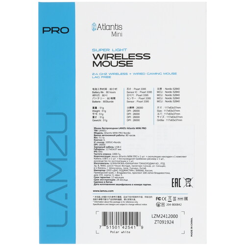 Мышь беспроводная/проводная LAMZU Atlantis MINI PRO оснащена 1.8-метровым кабелем в тканевой оплетке для проводного подключения к компьютеру. Модель также поддерживает беспроводное подключение при помощи радиоканала. Точность управления обеспечивает оптический светодиодный сенсор PixArt PAW3395 с настраиваемым разрешением в диапазоне 400-26000 dpi. Частота опроса 1000 Гц гарантирует точное положение курсора при перемещении манипулятора. Для комфортного управления устройством правой или левой рукой корпус имеет симметричную форму.