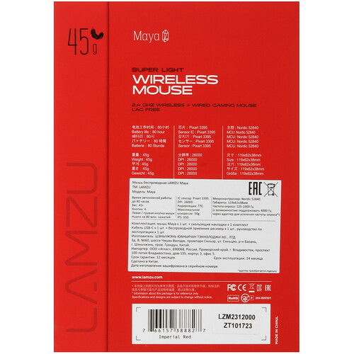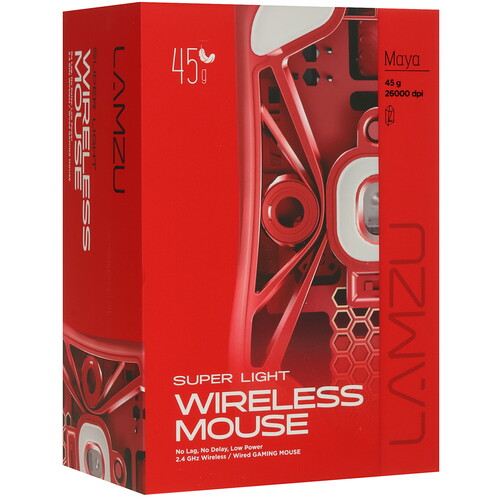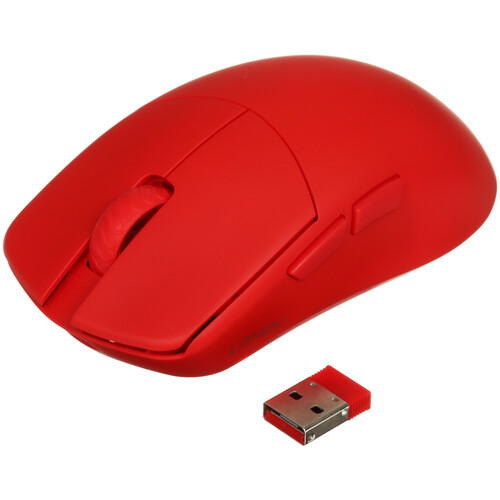 6-клавишная мышь беспроводная/проводная LAMZU Maya с дизайном в красном цвете отличается легкостью: масса устройства равна 45 г. Это игровой манипулятор с программируемыми кнопками и возможностью подключения к компьютеру по USB или радиоканалу. Модель оснащена оптическим светодиодным датчиком PixArt PAW3395 с максимальным разрешением 26000 dpi и частотой опроса до 4000 Гц. Манипулятор поддерживает ускорение до 50 G. Показатели обеспечивают игроку преимущество во многих динамичных видеоиграх.