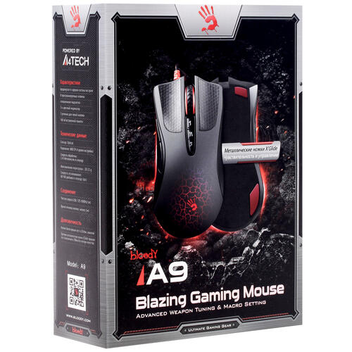 Пластиковые, прорезиненные кнопки предусматривают цикл износостойкости в 20 млн кликов. Передовая технология 16-ступенчатой калибровки обеспечивает высокую чувствительность и быструю реакцию курсора на движения манипулятора. За плавность скольжения A4Tech Bloody Blazing A9 отвечают прочные металлические ножки Armor Metal Mouse Feet. Встроенная в мышь память объемом 160 КБ позволяет маневрировать восемью имеющимися кнопками для создания персональных интерфейсов, записывая до 4000 отдельных команд, макросов и комбинаций.