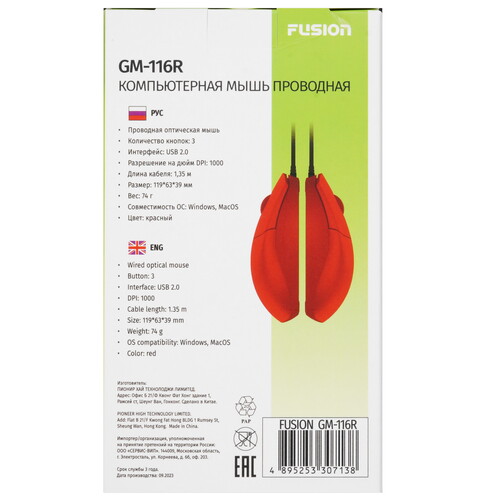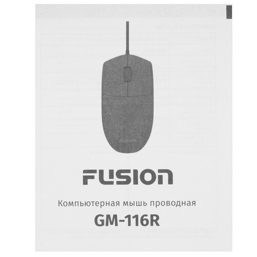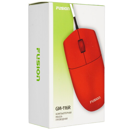 Встроенный в мышь проводную Fusion GM-116R оптический светодиодный датчик обладает оптимальным разрешением в 1000 dpi. Это предполагает возможность плавно двигать мышь по поверхности стола или коврика, чтобы курсор на экране перемещался точно, без резких скачков. Для подключения мыши к ПК используется кабель длиной 1.35 м в полиуретановой оплетке. В качестве интерфейса подключения используется USB Type-A, за счет чего мышь совместима с большинством моделей ноутбуков и компьютеров.
