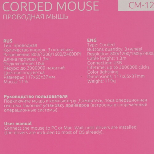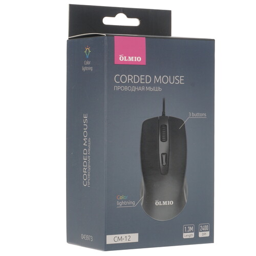 Мышь проводная Olmio CM-12 – отличный манипулятор для работы за компьютером дома или в офисе. Внешний вид представленного устройства, облаченного в корпус черного цвета, можно назвать интересным и оригинальным за счет RGB-подсветки, которая добавит индивидуальность в оформление компьютерного стола. Одной из особенностей этой модели стал оптический светодиодный сенсор с изменяемым разрешением вплоть до 2400 dpi. В зависимости от ваших предпочтений к скорости перемещения курсора и решаемых задач, вы сможете настроить работу манипулятора именно так, как вам нужно.