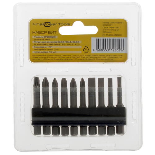 Набор бит FinePower BFD0520 использует для установки стандартный шестигранный хвостовик 1/4". Благодаря этому оснастка может использоваться как с шуруповертами, так и с ручными отвертками. Поставка набора бит осуществляется в фирменной упаковке-блистере.