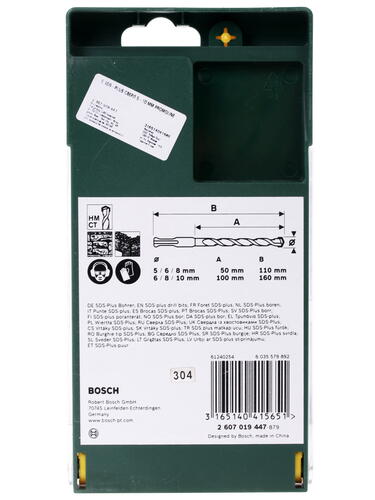 Для того чтобы просверлить отверстие в кирпичной либо бетонной стене понадобится бур для перфоратора Bosch SDS plus 2607019447. Эта модель поставляется в наборе из 6-ти инструментов с различными характеристиками. В комплекте буры следующих размеров: 10х160 мм, 8х160 мм, 6х160 мм, 8х110 мм, а также 6х110 мм и 5х110 мм. Каждый из инструментов имеет особую форму спирали, которая способствует моментальному удалению пыли от сверления. Благодаря специальной форме режущего инструмента уменьшается нагрузка на бур, а это увеличивает срок эксплуатации изделия.