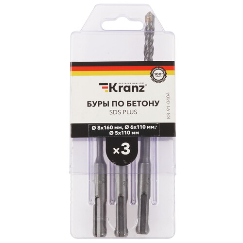 Набор буров по бетону 5x110 мм, 6x110 мм, 8x160 мм, 3 шт, SDS Plus KRANZ KR-91-0404 предназначен для сверления и бурения отверстий в слабоармированном бетоне, граните, кирпиче и камне при помощи специального электроинструмента с типом крепления SDS PLUS. Изделие выполнено из высококачественной стали, что обеспечивает долговечность оснастки. Благодаря конструкции со стабилизирующей спиралью сохраняется точное положение бура во время сверления и равномерно распределяется ударная нагрузка.
