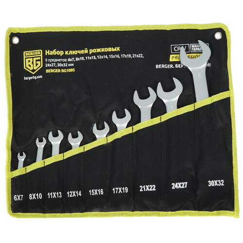 В наборе BERGER BG1095 представлено 9 полезных приспособлений. Ключи обладают захватом от 6x7 мм до 30x32 мм. Комфортной транспортировке и хранению инструментов способствует наличие удобного чехла с отдельными кармашками для всех элементов.