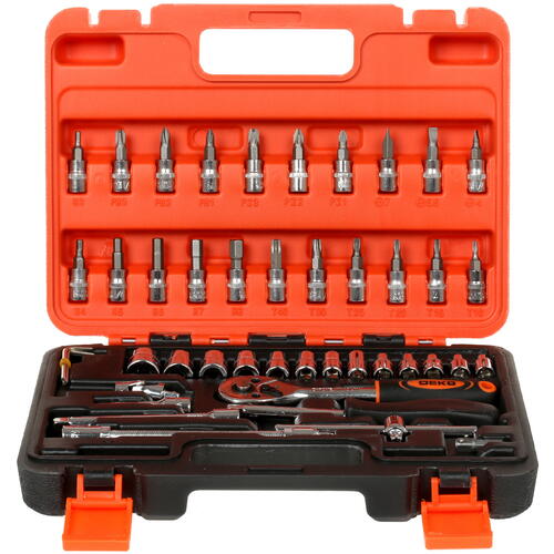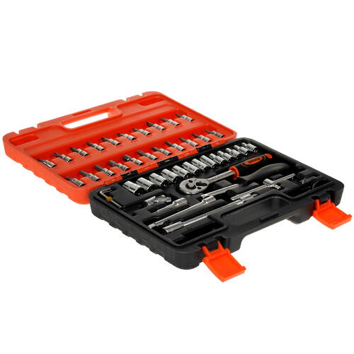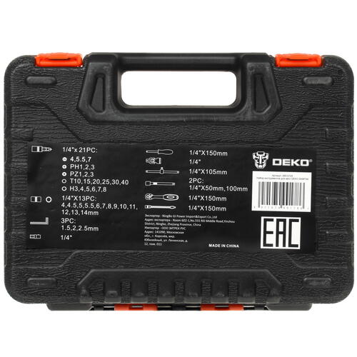 Набор инструментов DEKO DKMT46 065-0729 поставляется в надежном пластиковом кейсе, содержащем 45 предметов. Они закреплены внутри кейса и для каждого из них предусмотрено свое место, что обеспечивает легкий поиск и удобство пользования. Комплект содержит биты, торцевые головки, отвертки, удлинители, вороток 105 мм, карданный шарнир для головок, трещотку, насадку для головок, держатель-отвертку для фиксации бит.