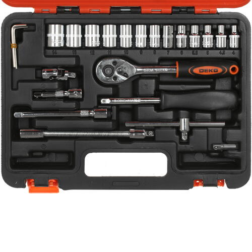 При помощи инструментов из набора DEKO DKMT46 065-0729 возможен домашний ремонт различных конструкций, а также обслуживание автомобилей. Изготовлены инструменты из закаленной стали повышенной прочности, прошедшей обработку, что делает их более долговечными и рассчитанными на высокие нагрузки. Дополнительная обработка позволяет защитить изделия от коррозийного воздействия, не допускает физических деформаций. Инструменты помогут работать со сложными и заглубленными крепежами благодаря карданам и удлинителям.