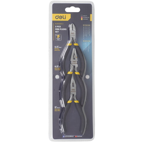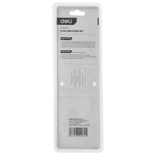 Набор инструментов Deli DL103205-3 состоит из комбинированных и удлиненных плоскогубцев, диагональных бокорезов. Прорезиненные ручки не дают мини-плоскогубцам выскальзывать из ладони. Рабочая часть инструментов из углеродистой стали устойчива к появлению вмятин и подобных деформаций.