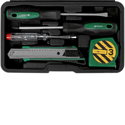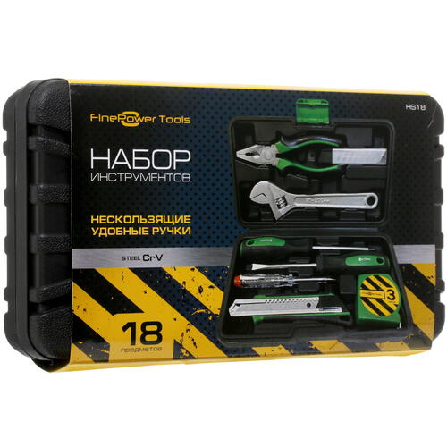 Набор инструментов FinePower HS18 содержит востребованные принадлежности, необходимые для ремонтных и строительных работ. В него входят 8 предметов – отвертки, рулетка, канцелярский нож, плоскогубцы, разводной ключ, тестер напряжения. Изготовленные из хромованадиевой стали с антикоррозийным покрытием, инструменты FinePower HS18 отличаются высокой прочностью и устойчивостью к повреждениям на протяжении долгого срока эксплуатации. Компактный пластиковый кейс гарантирует упорядоченное хранение и удобство транспортировки инструментов.