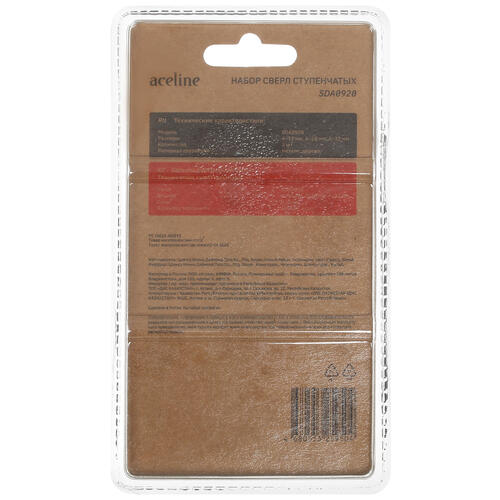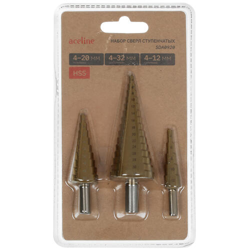 Набор сверл Aceline SDA0920 предназначен для создания отверстий разного диаметра в тонком металле, древесине, пластике, фанере и других материалах. В комплекте поставляются 3 ступенчатых сверла с возможностью регулировки диаметра отверстия от 4 до 32 мм. Фиксация в патроне дрели-шуруповерта осуществляется посредством шестигранного хвостовика стандарта HEX. Сверла Aceline SDA0920 изготовлены из стали марки HSS, что гарантирует высокую производительность и прочность. Благодаря нитрид-титановому покрытию повышается стойкость к внешним воздействиям и износу.