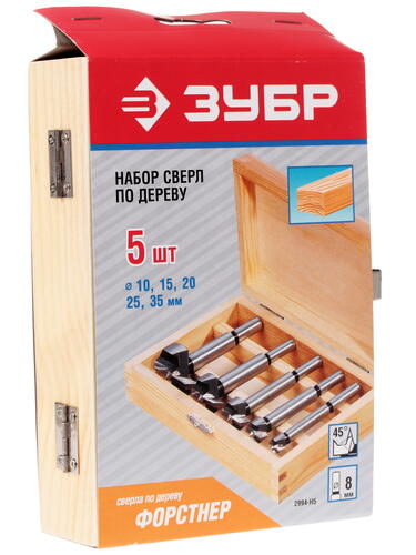 ЗУБР 2994-H5 - набор сверл Форстнера. Сверла предназначены для сверлении отверстий в древесине, фанере, ДСП, клеёных щитах и пластике. Особенность конструкции позволяет сверлить глухие и сквозные отверстия повышенной точности, что отлично подходит для монтажа мебельной фурнитуры. Сверла обладают повышенной производительностью, имеют оптимальные углы заточки и выполнены из высококачественных сталей.