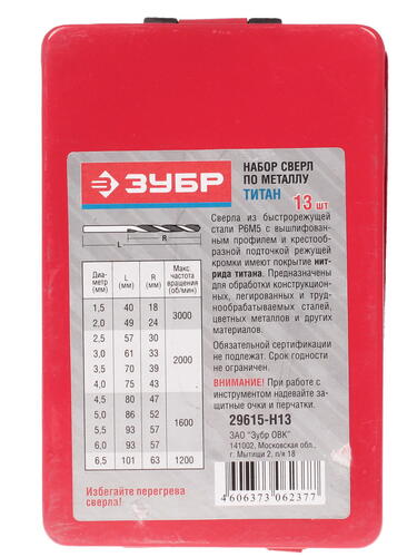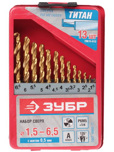 Набор сверл ЗУБР "ЭКСПЕРТ" 29615-H13 предназначен для обработки легированных и углеродистых сталей с пределом прочности до 900Н/мм2, цветных металлов, серого чугуна и пластмассы. Качественные и точные сверла с большим ресурсом! Изготовлены из стали Р6М5 и имеют высокую теплостойкость и продолжительный срок службы. Сверла изготовлены методом шлифования профиля и соответствуют классу точности сверления "А1". Крестообразная подточка позволяет начать сверлить без предварительного кернения. Угол заточки при вершине равный 135° повышает производительность работ.