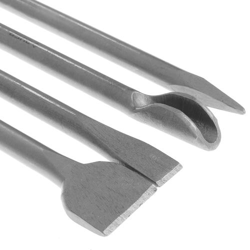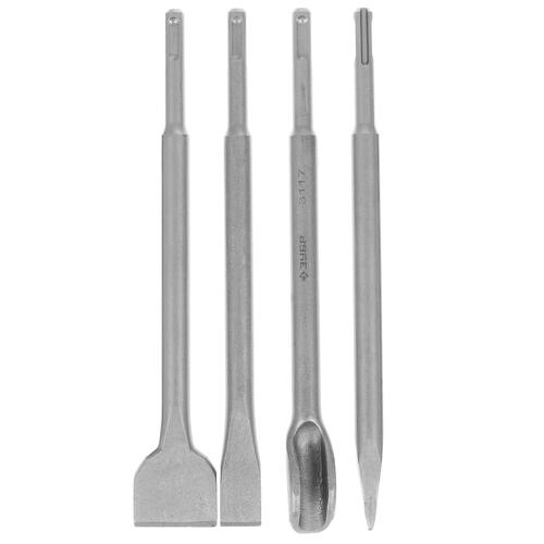 Набор зубил ЗУБР 29230-H4 поставляется комплектом из 4 разнотипных изделий (плоское, плоское широкое, пиковое и канальное). Использовать их можно для ударной работы в составе электроинструмента с отверстием для крепления SDS-plus. Применяя зубила, можно работать по бетону, кирпичу и камню. Изготовлены комплектующие из инструментальной стали трехступенчатой индукционной закалки. Это обеспечивает им исключительную прочность при повышенных нагрузках. Длина каждого зубила из набора ЗУБР 29230-H4 составляет 25 см, а ширина – 1.6 см.