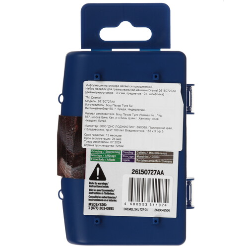 Насадки для гравировальной машинки Dremel 26150727AA подключаются посредством хвостовика диаметром 3.2 мм. Набор представлен 31 сменными инструментами для полирования, заточки, шлифования, резки заготовок по дереву и металлу: абразивные круги и ленты, отрезные круги, оправка, шлифовальные камни. Они просто фиксируются на инструменте и извлекаются при необходимости замены. Для удобства хранения и использования насадки Dremel 26150727AA поставляются в пластиковом кейсе с прозрачной крышкой и подвесом.
