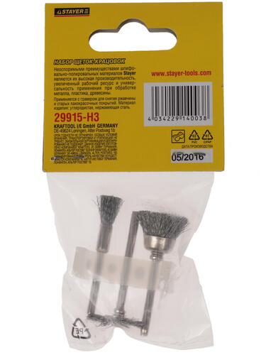Насадки для гравера Stayer 29915-H3 – это щетки-крацовки для зачистки рабочих поверхностей металлических деталей и заготовок при проведении различных гравировальных работ. Выполненные из нержавеющей стали щетки долго не стираются, отличаются отличным рабочим ресурсом. Они помогут быстро удалить ржавчину, старую краску, что позволит произвести дальнейшие операции с поверхностями более тщательно и качественно. Для большей эффективности при зачистке различных по структуре поверхностей и разных по форме изделий, в том числе и в труднодоступных местах, в комплекте насадок для гравера Stayer 29915-H3 идут 3 щетки разной формы: крацовка чашечная, крацовка торцевая, крацовка дисковая.