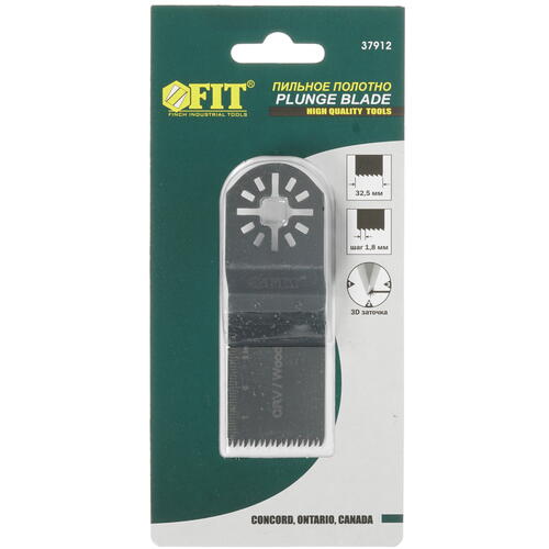 Приспособление FIT 37912 поставляется в прочном пластиковом блистере, не позволяющем случайно порезаться при транспортировке насадки. Изделие имеет вид шлифованного ступенчатого полотна с размерами 32.5x0.6 мм. Насадка совместима с различными моделями реноваторов.