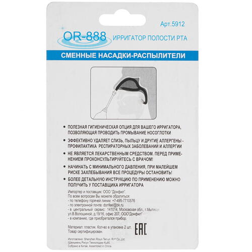 Сменная насадка Donfeel 5912 представляет собой дополнительный аксессуар, воспользовавшись которым у вас появится возможность провести тщательное очищение носоглотки в домашних условиях. Подходит для эксплуатации с ирригатором Donfeel OR-888.