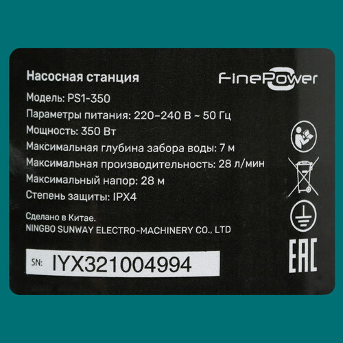 Насосная станция FinePower PS1-350 с центробежным механизмом и мощностью 350 Вт предназначена для перекачивания чистой воды в бытовых условиях. Степень защиты IPX4 гарантирует устойчивость к брызгам. Производительность 28 л/мин предусматривает забор воды из глубины до 7 м.