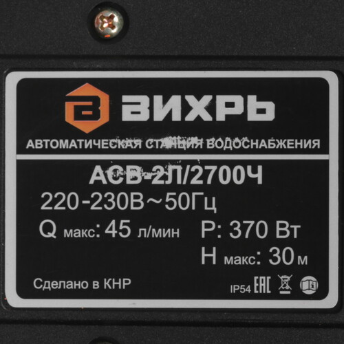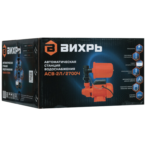 Насосная станция Вихрь АСВ-2Л/2700Ч предназначена для бесперебойного водоснабжения в автоматическом режиме, коттеджей, дач, ферм и других потребителей. Из особенностей можно выделить то, что корпус выполнен из чугуна. Данная модель поддерживает необходимое давление в системе водоснабжения, самостоятельно включаясь и отключаясь по мере расходования воды потребителями. АСВ-370/2Ч обладает мощностью 370 Вт, максимальная глубина всасывания 9 метров, максимальная подача воды 45 литров в минуту, максимальный напор 30 метров. Емкость гидроаккумулятора составляет 2 литра.