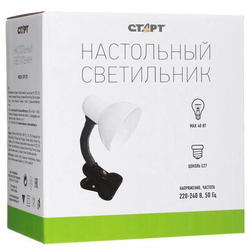 Настольный cветильник СТАРТ CT03 с основанием на прищепке – универсальное решение для дома или офиса. Он обеспечит удобство чтения и выполнения различных задач при недостаточном освещении. Светильник оборудован цоколем E27 и имеет ограничение по мощности 40 Вт.