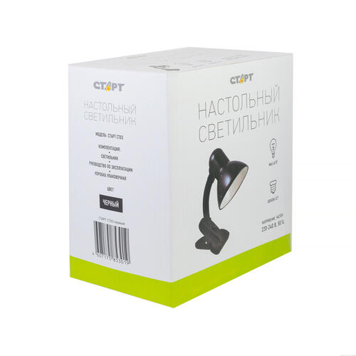 Комбинированная конструкция настольного светильника СТАРТ CT03 очень удобная в эксплуатации. Она оснащена основой в виде прищепки, которую можно прикрепить к любой рабочей поверхности, требующей дополнительного освещения. В лампе СТАРТ CT03 производитель предпочел установить цоколь E27. Максимальная мощность данного прибора приравнивается к 40 W, благодаря чему он является износостойким и без особого ущерба переносит перепады температур.