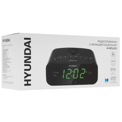 Радиобудильник Hyundai H-RCL221 поддерживает диапазон FM от 87.5 до 108 МГц. В модели реализована зеленая подсветка дисплея. Радиобудильник Hyundai H-RCL221 отображает время и дату.