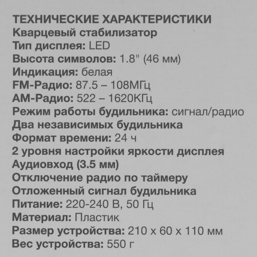 будильник, радио, подсветка дисплея, тип питания - от батареек, от сети, резервное питание от батареек