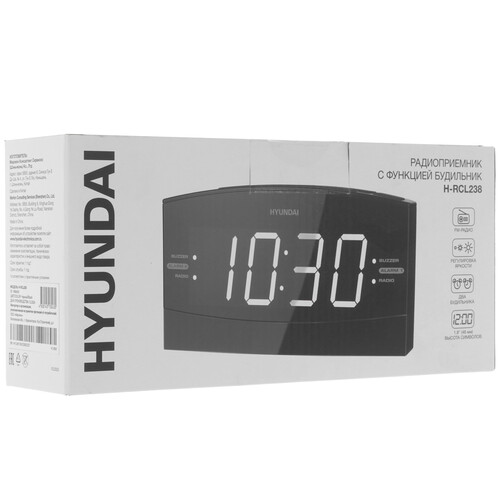 Радиобудильник Hyundai H-RCL238 поддерживает 2 диапазона – FM от 87.5 до 108 МГц и AM от 522 до 1620 кГц. В модели реализована белая подсветка дисплея. Радиобудильник Hyundai H-RCL238 отображает время и дату.