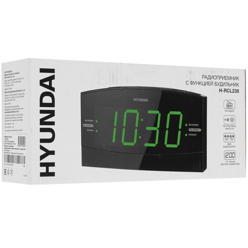 Радиобудильник Hyundai H-RCL238 с LED-дисплеем и зеленой подсветкой позволяет видеть время в любое время суток. Устройство показывает дату и время, включать выбранную радиостанцию по будильнику. Модель может работать от двух батареек «мизинчиков» или от сети.