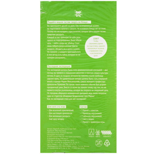 Эта экспедиция должна была стать археологической сенсацией: два месяца вы провели в перуанских джунглях в поисках следов культуры мочика. В один из поздних вечеров вы наконец нашли гробницу царских жриц. Эта удивительная находка должна была стать очередной вехой в карьере Марии Фельзенштейн, самого молодого профессора археологии Германии. По случаю такого важного события был устроен праздничный ужин. Вместе со всеми вы ломали голову над тем, что же окажется внутри усыпальницы, которую вы откроете на следующий день. Но праздник обернулся неожиданной трагедией, ведь около полуночи один из студентов обнаружил бездыханное тело Марии! Как эта экспедиция стала для неё последней?