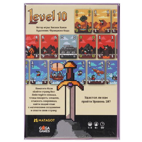 Уровень 10 — это причудливая карточная головоломка, притворяющаяся портативной игровой приставкой. Но если, например, в Game Boy можно было играть только одному, то здесь взять на себя управление персонажем сможет и компания до пяти человек. Наш герой собрался в своё первое приключение, и вы нужны ему! Чтобы Иззи смог преодолеть все пять миров, разыгрывайте карты уровней в строго определённом порядке, постарайтесь ни разу не сбиться и не оказаться в безвыходном положении.