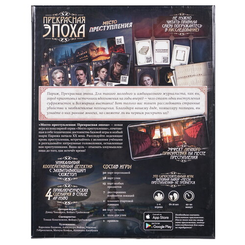 "Место преступления: Прекрасная эпоха" – это логическая настольная игра, являющаяся второй частью серии "Тысячелетие", которая повествует историю древнего рода Лавель из Парижа. Представители этой династии всегда славились своими особыми детективными навыками и сюжет этих игр связывает в единую эпопею приключения этих героев из разных эпох.