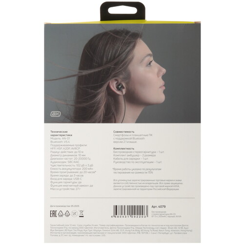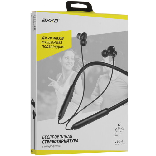 AXXA AN-01 - беспроводная внутриканальная стереогарнитура с шейным ободком и временем работы до 20 часов от встроенного аккумулятора.