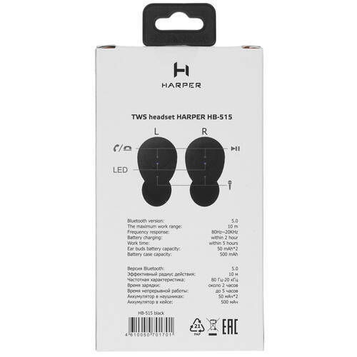 Наушники TWS HARPER HB-515 сочетают классический дизайн, простую конструкцию и удобство в пользовании. Они комфортно располагаются в ушном канале и обеспечивают качественное воспроизведение аудиоконтента благодаря 6-мм излучателям. За четкость передачи голоса отвечает интегрированный микрофон.