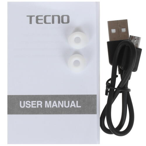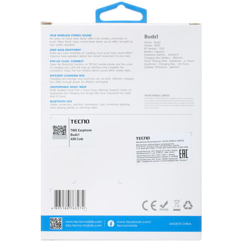 Подключение Tecno Buds 1 к устройствам производится при помощи беспроводного протокола Bluetooth 5.0, который отличается большим радиусом действия, а также малым потреблением энергии. В качестве источника питания модель использует встроенные аккумуляторы как в сами наушники, так и в сам кейс. Поставка устройства осуществляется в фирменном картонном боксе вместе с кабелем для зарядки.