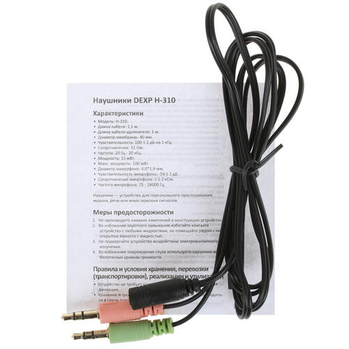 DEXP H-310 использует проводное подключение при помощи кабеля длиной 1.1 м. Позолоченный штекер исключает помехи и искажения при передаче звука. Наушники с мягкими амбушюрами крепятся на оголовье. Возможность регулировки оголовья позволяет настроить оптимальное положение корпуса, чтобы не ощущать дискомфорта даже во время длительного прослушивания музыки. На проводе зафиксирован микрофон и пульт управления с кнопкой, позволяющей отвечать на вызовы и завершать их.