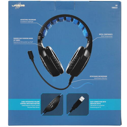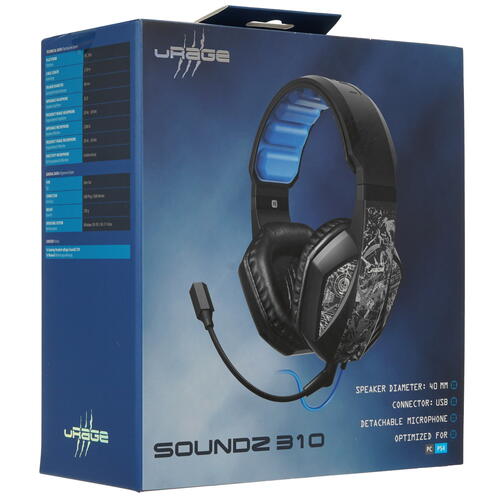 Стереогарнитура для видеоигр Hama uRage SoundZ 310 присоединяется к порту USB ПК или ноутбука за счет 2.5-метрового кабеля. На проводе находится пульт с регулятором громкости звука и клавишами, которые отвечают за включение/выключение звука, включение/выключение микрофона.