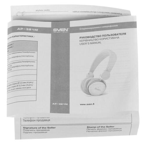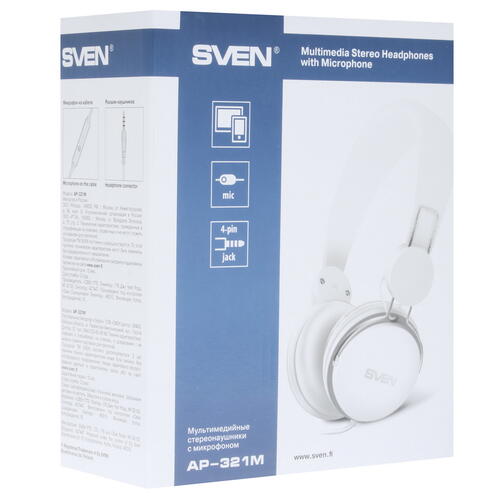 Sven AP-321M с поддержкой диапазона частот 20-20000 Гц и сопротивлением 32 Ом соответствуют формату 2.0 и предусматривают проводное подключение с использованием кабеля длино 1.2 м. На нем имеется стандартный прямой штекер jack 3.5 мм. На кабеле расположен пульт управления устройством, позволяющий переключать композиции, ставить воспроизведение на паузу и отвечать на вызовы, а также чувствительный микрофон.