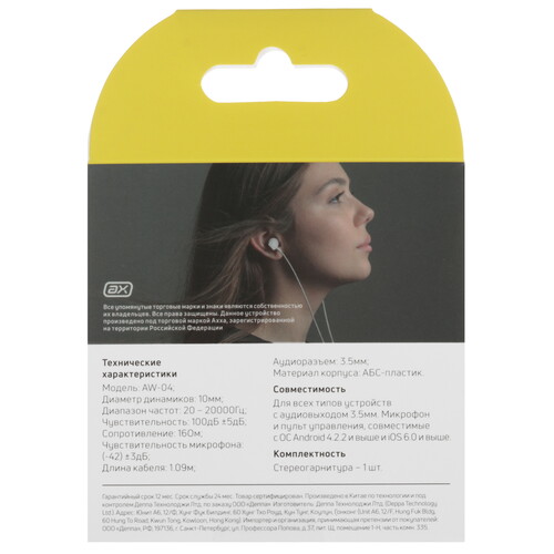 Внутриканальные проводные наушники AW-04 обеспечат вам комфортное прослушивание любимой музыки благодаря удобному креплению в ушной раковине. Диапазон воспроизводимых частот составляет 20-20000 Гц, а диаметр динамиков – 10 мм, что позволяет насладиться богатым и чистым звуком без искажений. Чувствительность наушников равна 100 дБ±3 дБ, импеданс – 16 Ом. Наушники выполнены из высококачественного ABS пластика и представлены в стильном белом цвете.