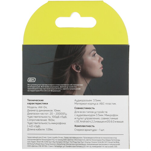Внутриканальные проводные наушники AW-04 обеспечат вам комфортное прослушивание любимой музыки благодаря удобному креплению в ушной раковине. Диапазон воспроизводимых частот составляет 20-20000 Гц, а диаметр динамиков – 10 мм, что позволяет насладиться богатым и чистым звуком без искажений. Чувствительность наушников равна 100 дБ±3 дБ, импеданс – 16 Ом. Наушники выполнены из высококачественного ABS пластика и представлены в стильном черном цвете.