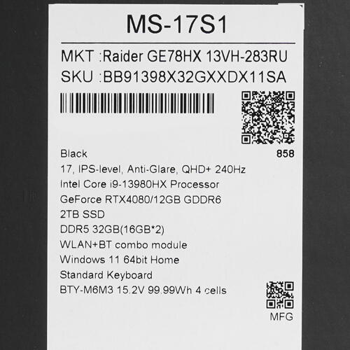17" Ноутбук MSI Raider GE78 HX 13VH-283RU черный [5410210]